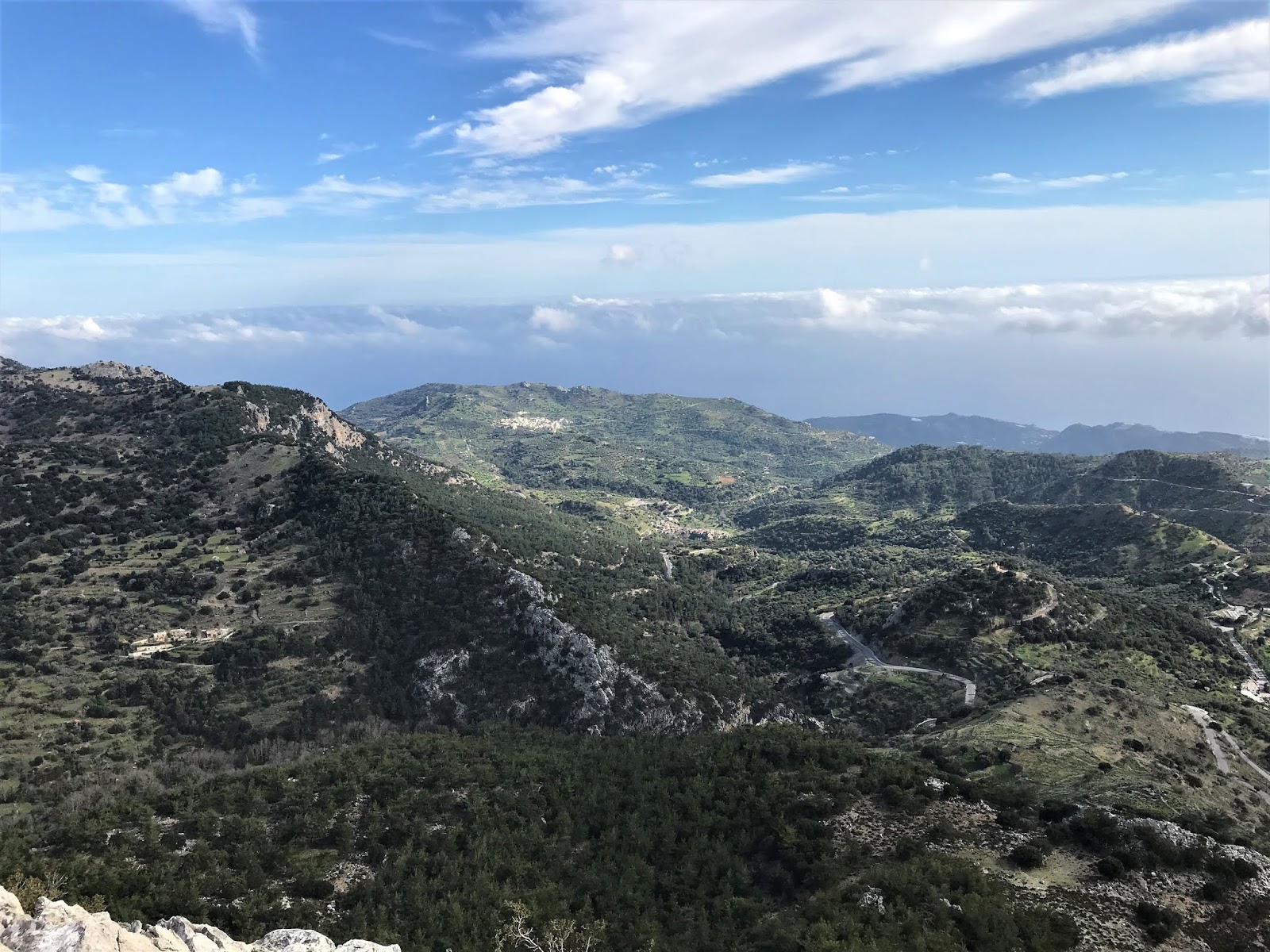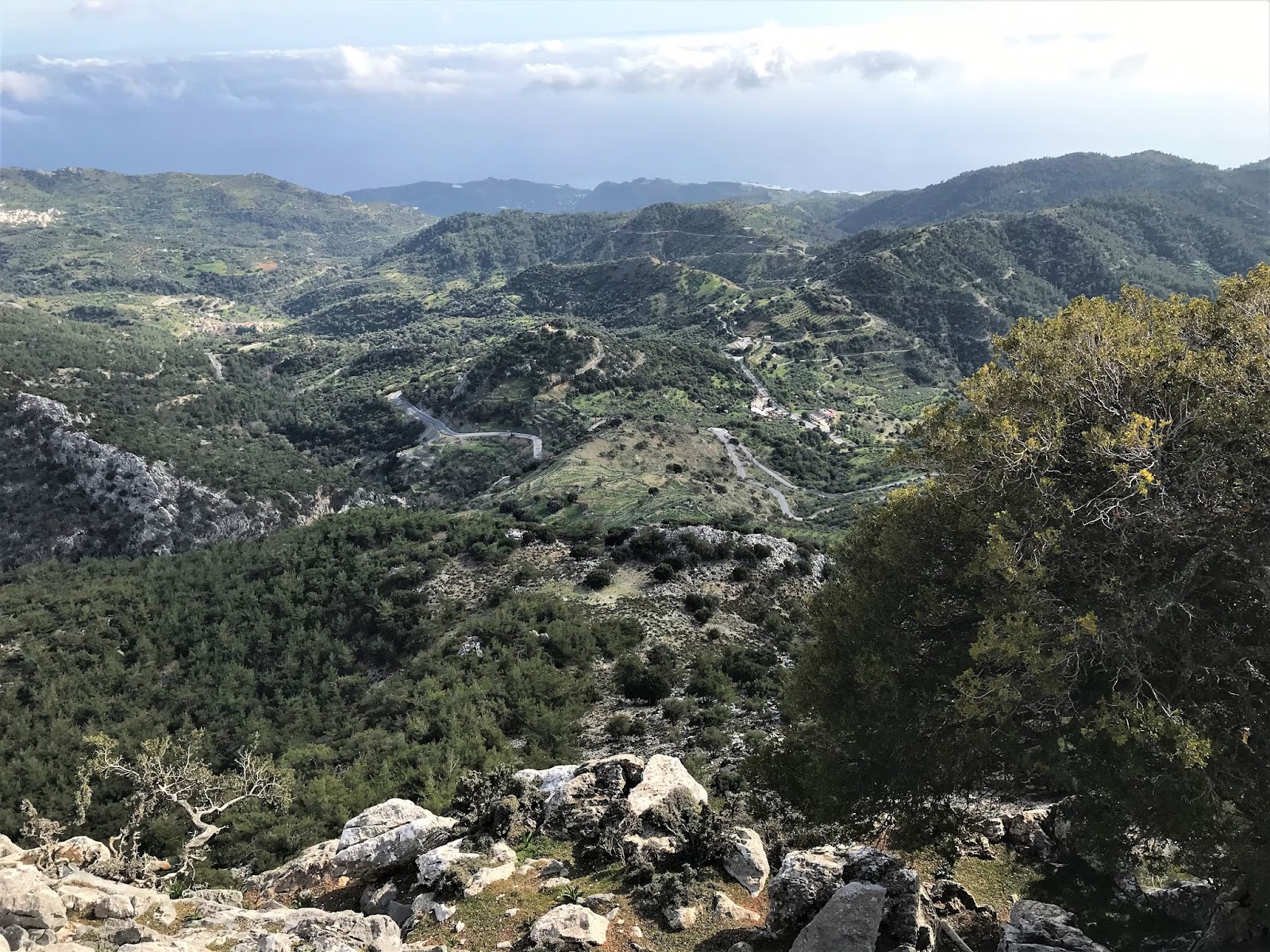 Από εκεί το μάτι γεμίζει πράσινο αγναντεύοντας τα χωριά και τις δασικές εκτάσεις της Βιάννου φθάνοντας μέχρι τo Νότιο Κρητικό Πέλαγος, από τη μια πλευρά, και τις κορυφές της Δίκτης από την άλλη.